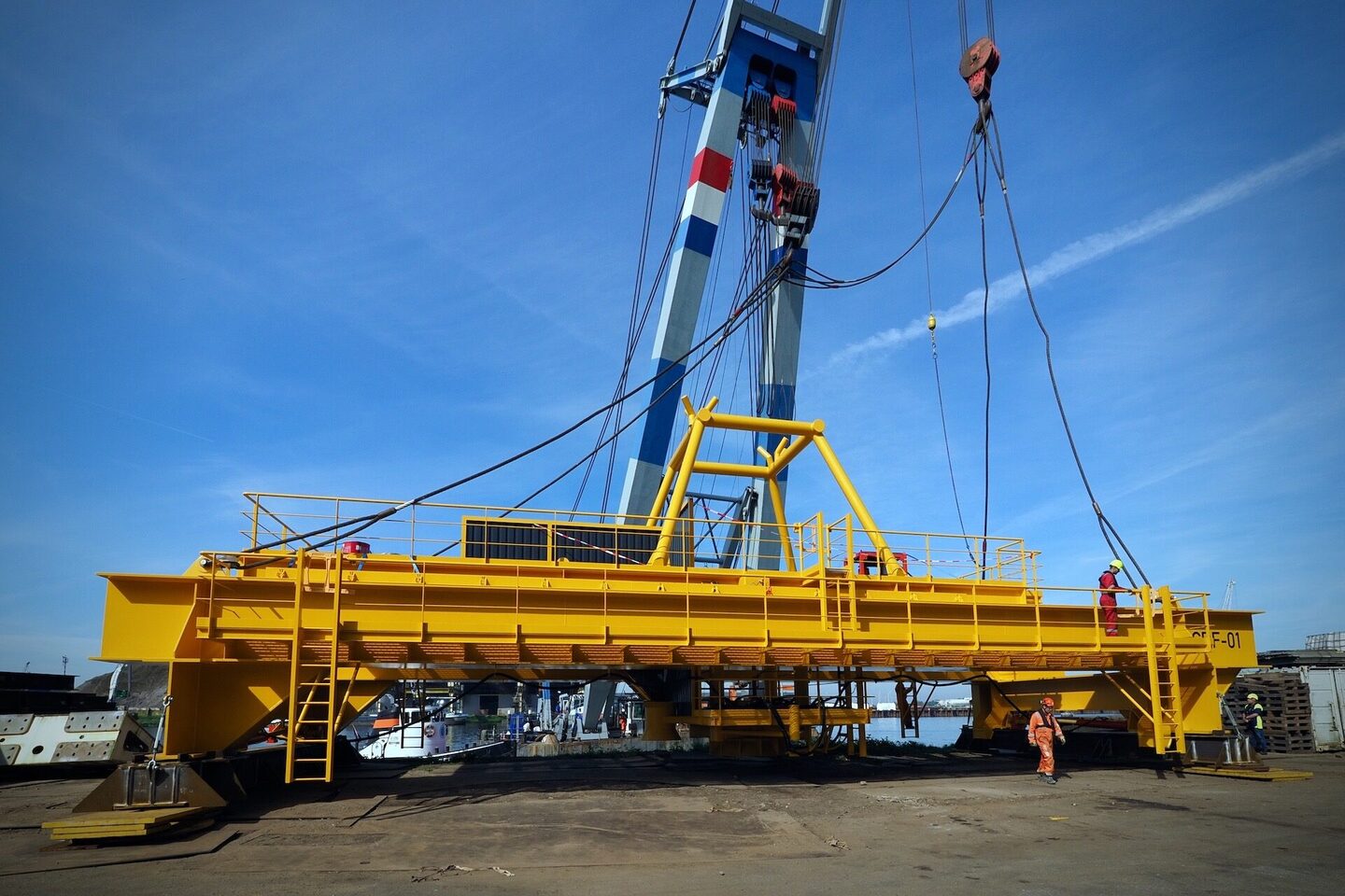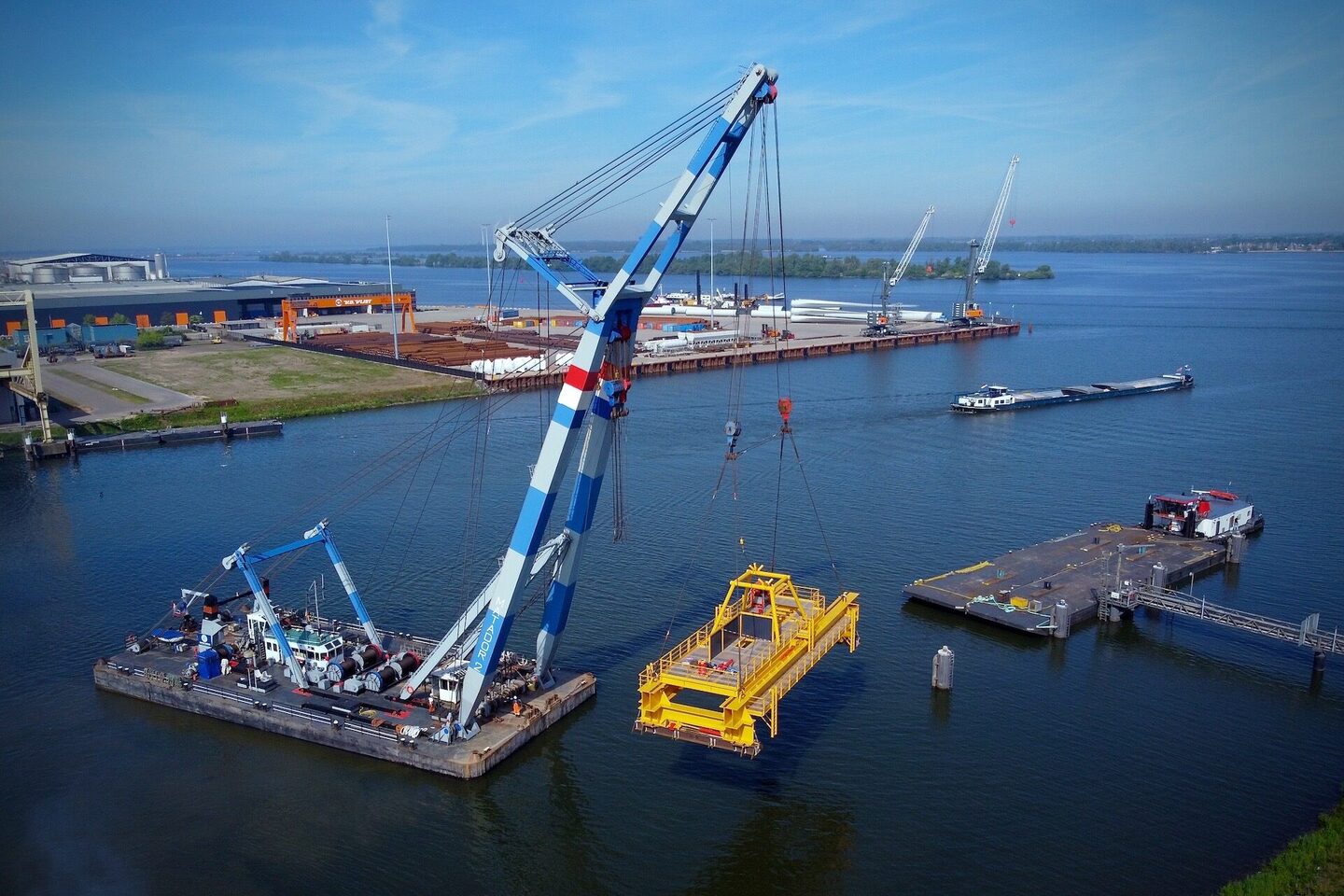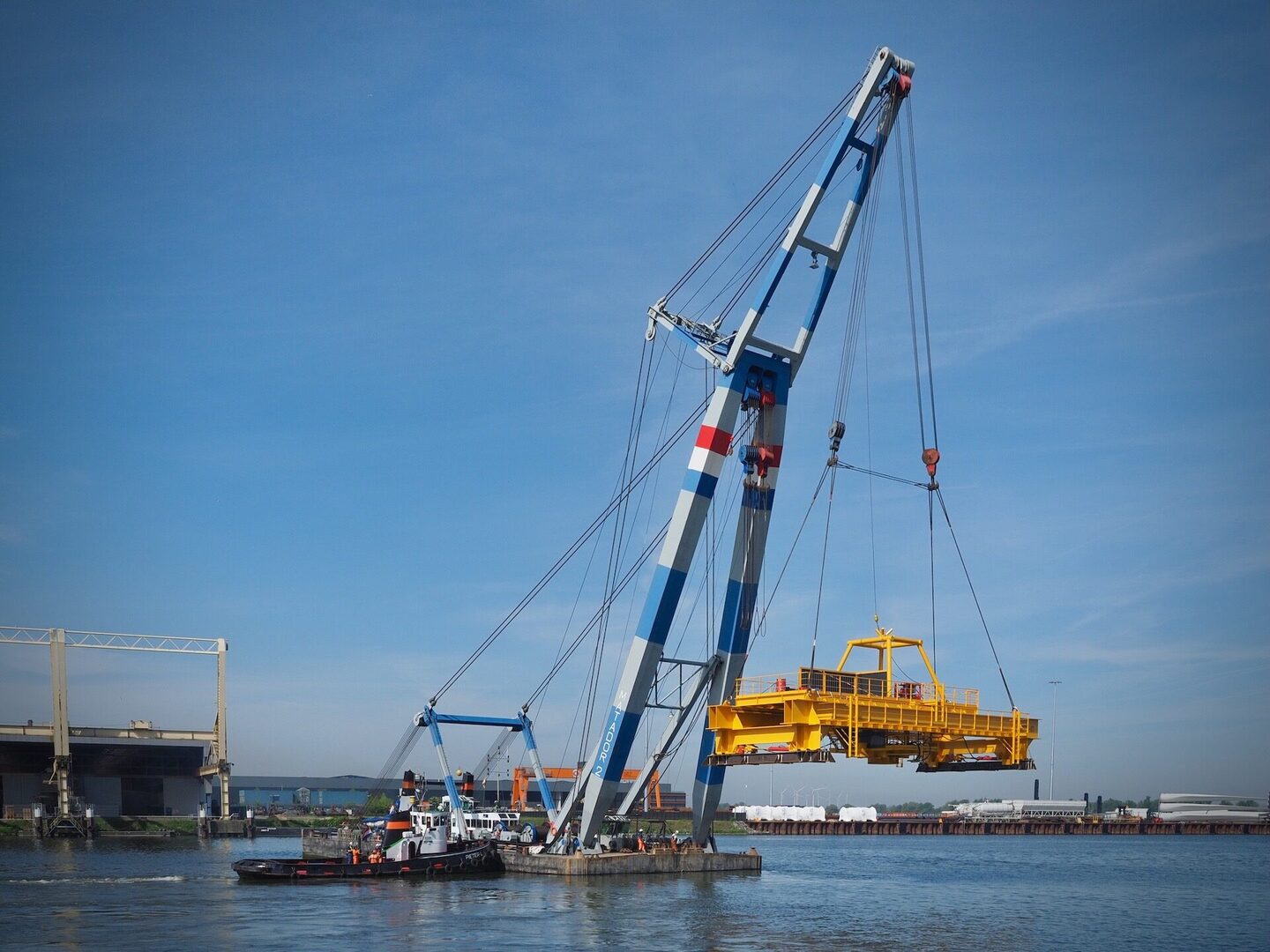 Dit 170 ton wegende frame is door de drijvende bok Matador 2 vanaf de wal op een ponton geplaatst voor verder transport over het water. Het Conductor Removal Frame is bedoeld om offshore ingezet te gaan worden bij de verwijdering van oude boorplatforms op zee. Dit specifieke frame is daarbij een hulpmiddel om de buizen naar boven te halen. Daarbij worden deze gelijk schoon geschraapt en met een tool in segmenten opgedeeld.