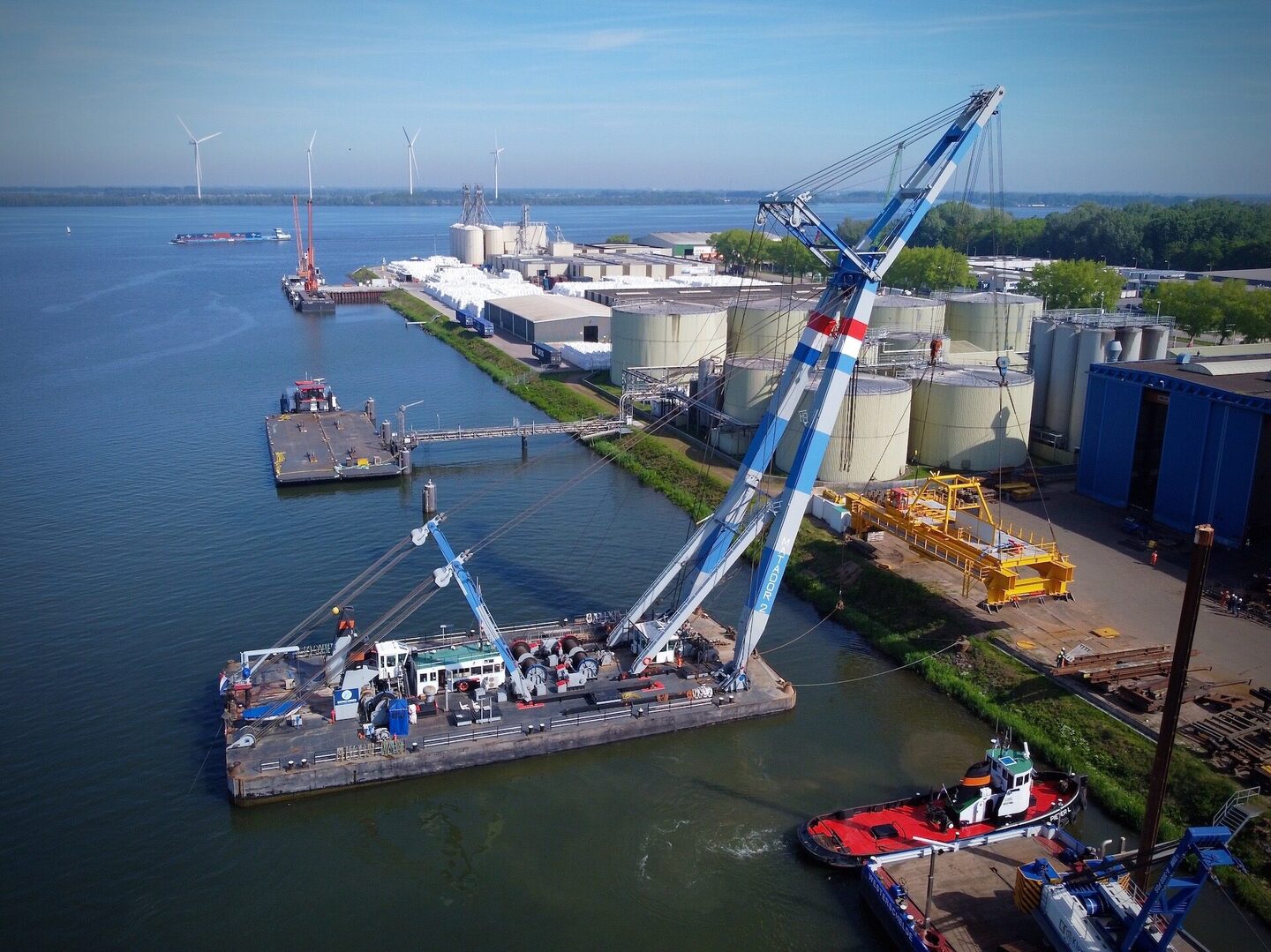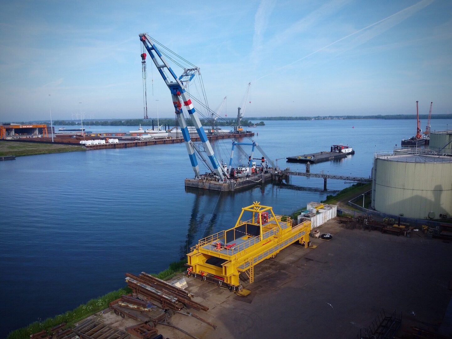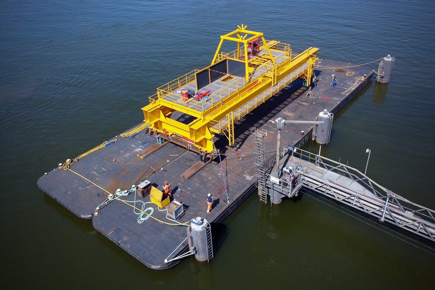 Dit 170 ton wegende frame is door de drijvende bok Matador 2 vanaf de wal op een ponton geplaatst voor verder transport over het water. Het Conductor Removal Frame is bedoeld om offshore ingezet te gaan worden bij de verwijdering van oude boorplatforms op zee. Dit specifieke frame is daarbij een hulpmiddel om de buizen naar boven te halen. Daarbij worden deze gelijk schoon geschraapt en met een tool in segmenten opgedeeld.