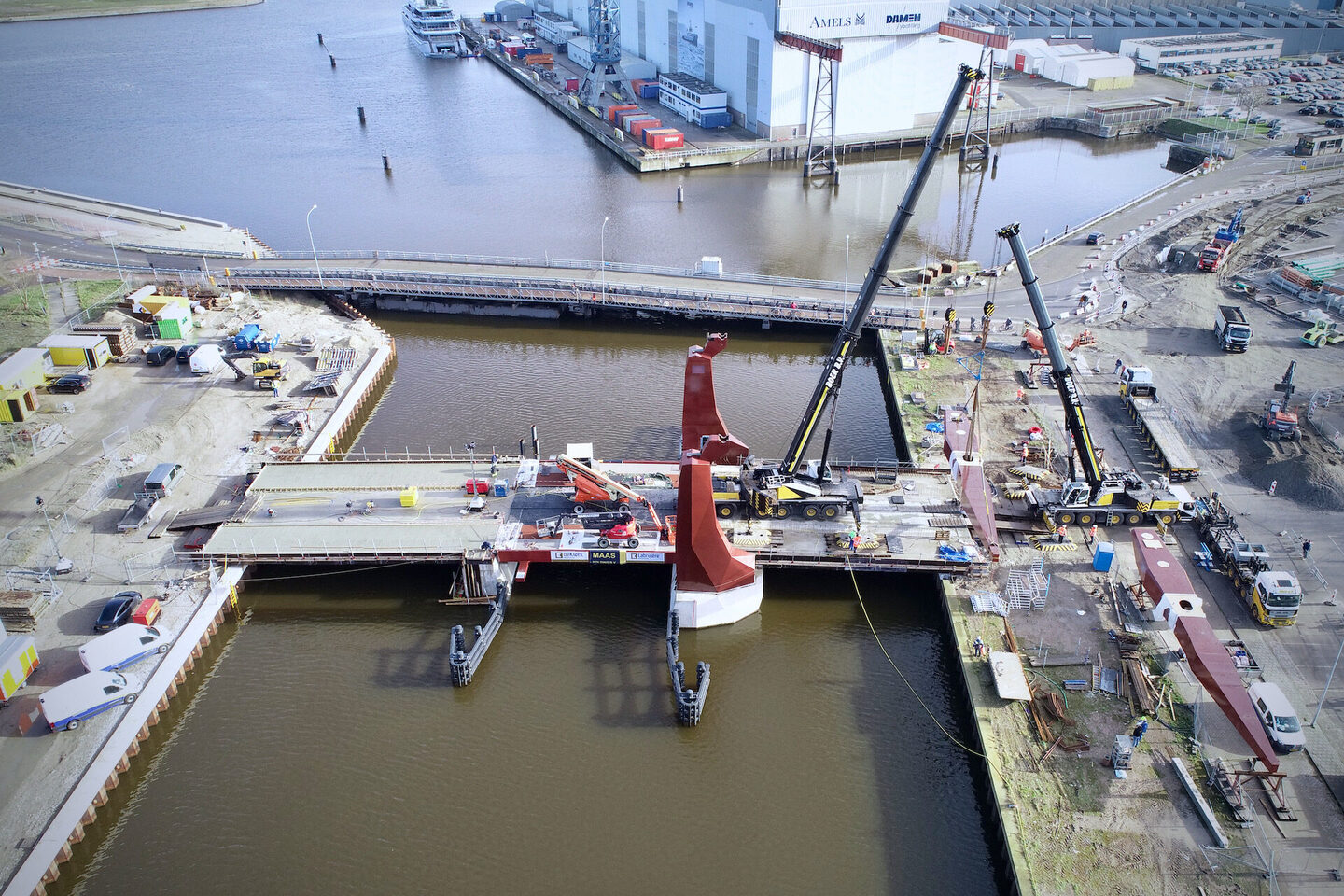 Hoofdaannemer Maas BV heeft de staalbouwkundige onderdelen laten fabriceren door De Klerk Staalbouw, waarbij Labrujère Services het werktuigbouwkundige deel en de montage heeft uitgevoerd. Opdrachtgever was de gemeente Vlissingen, ontwerpers buro MA.AN en ingenieursbureau Iv-Infra. Begin januari'21 werd begonnen met de brugval van 17 x 20m en een gewicht van 95 ton. Vlak daarna werden de twee hameistijlen, ieder met een gewicht van ruim 36 ton en een afmeting (op de voet) van 6,20 x 2,30m en een hoogte van 13,30m, op hun plaats gezet. En eind januari'21 werden de beide balanspriemen en hangstangen, ieder met een gewicht van bijna 49 ton en een lengte van ruim 25 meter, een breedte van 3 meter en een hoogte van 2,5 meter, op hun definitieve plek op de hameistijlen gezet.