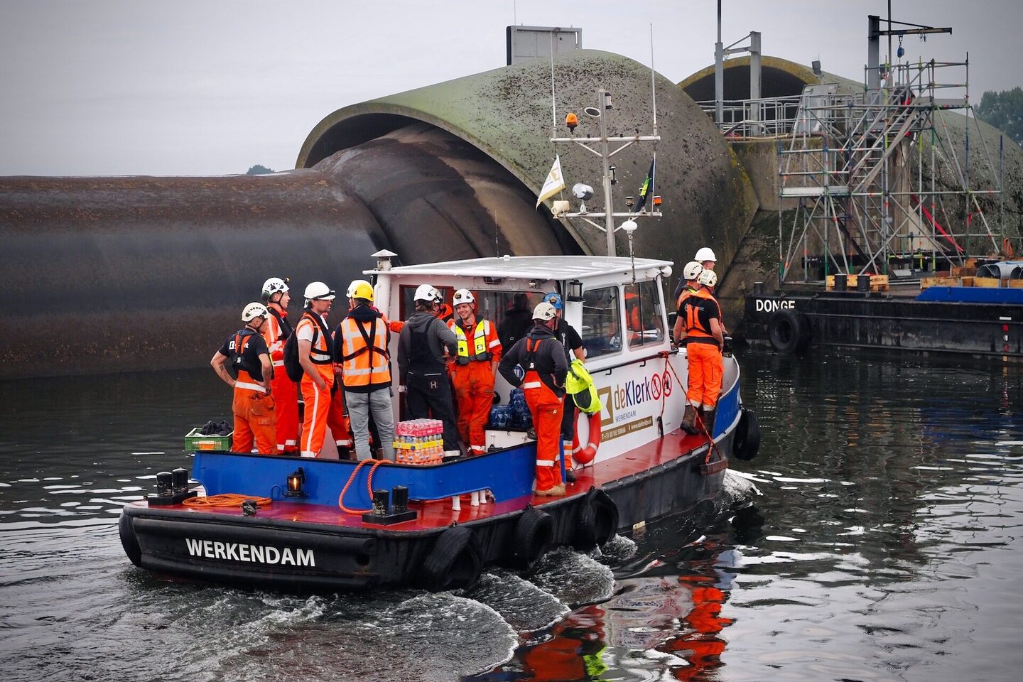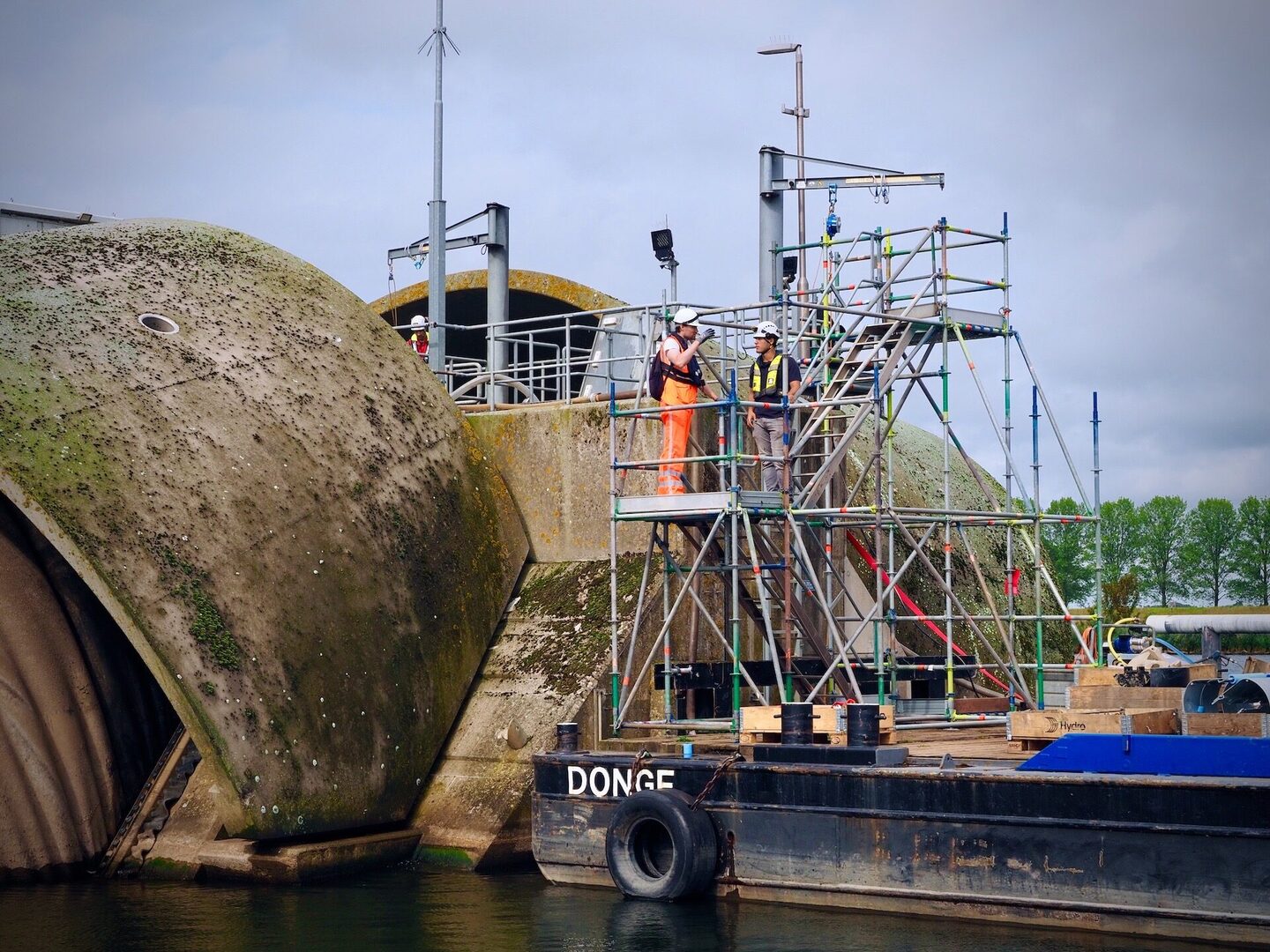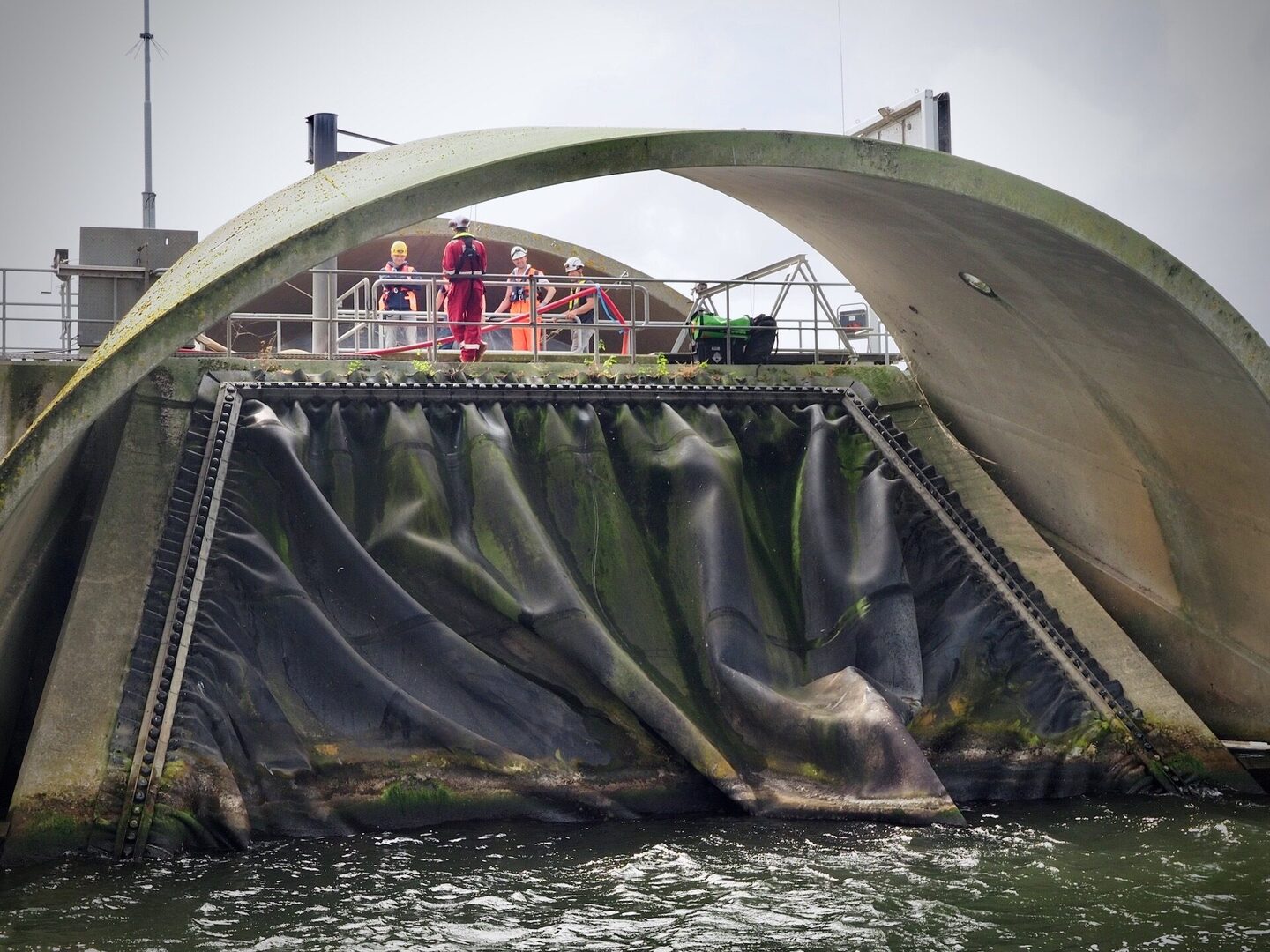 Het bijzondere van dit project is dat het onderhoud plaatsvindt in de balg, ca. zes meter onder waterniveau. Om in de balg te kunnen werken wordt deze opgeblazen, het water eruit gepompt en wordt in de ruimte een overdruk van 200 millibar opgezet, gelijk aan zo’n twee meter waterdiepte. De toegang tot de balg gaat via een luchtsluis van vier bij twee meter, met een deurbreedte van slechts één meter. Alle medewerkers, maar ook de materialen en gereedschap dienen via deze luchtsluis ingeschut te worden. Dit is bij elke schutting weer een logistieke uitdaging! De omstandigheden in de balg zijn intens. Naast de overdruk is het er donker en heerst er een hoge luchtvochtigheid. Onze medewerkers hebben daarom allen een duikmedische keuring ondergaan en de nodige veiligheidscursussen gevolgd.