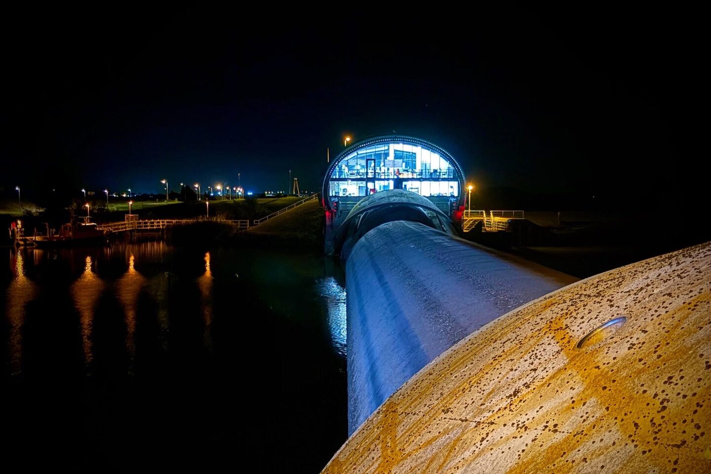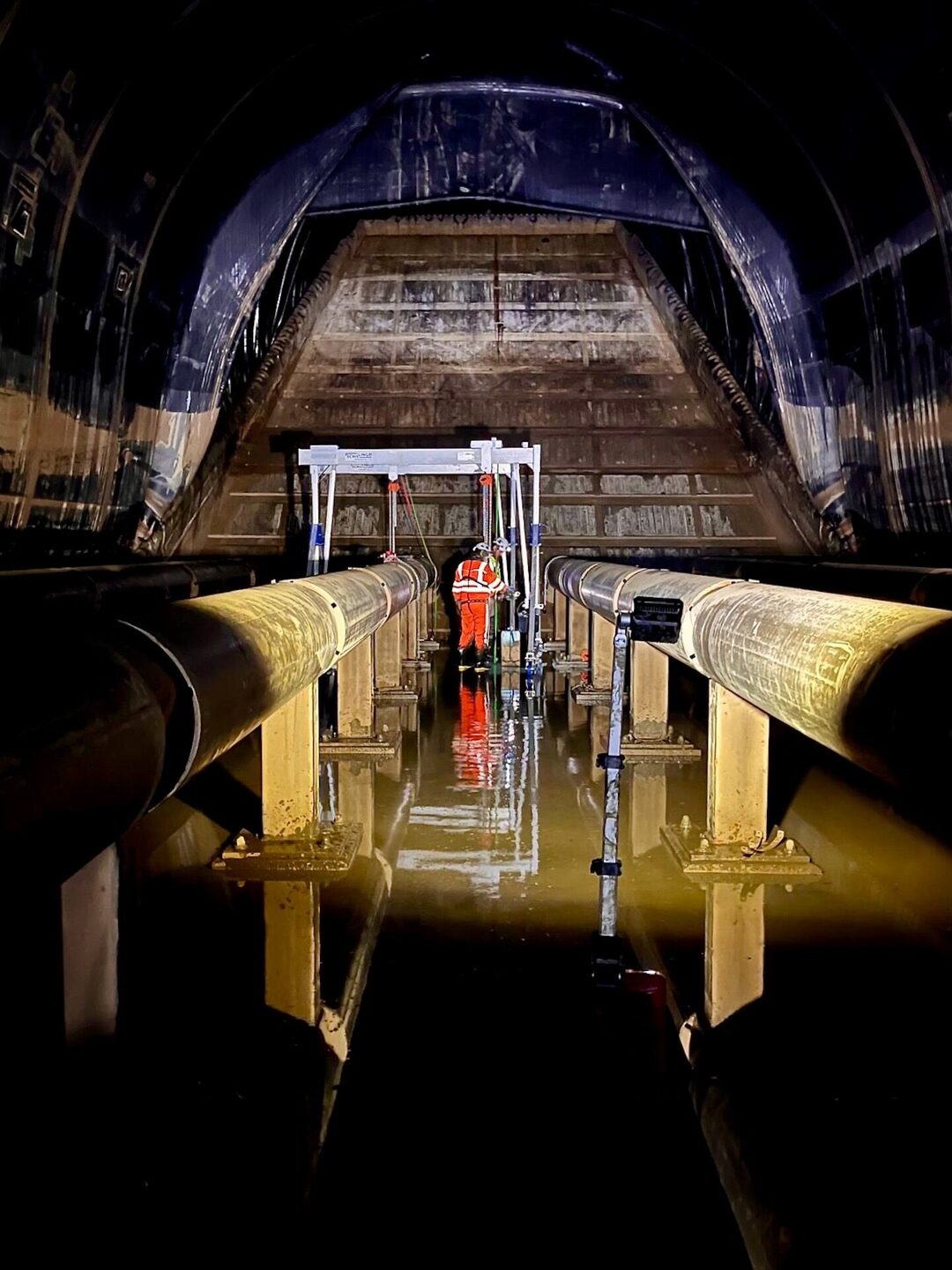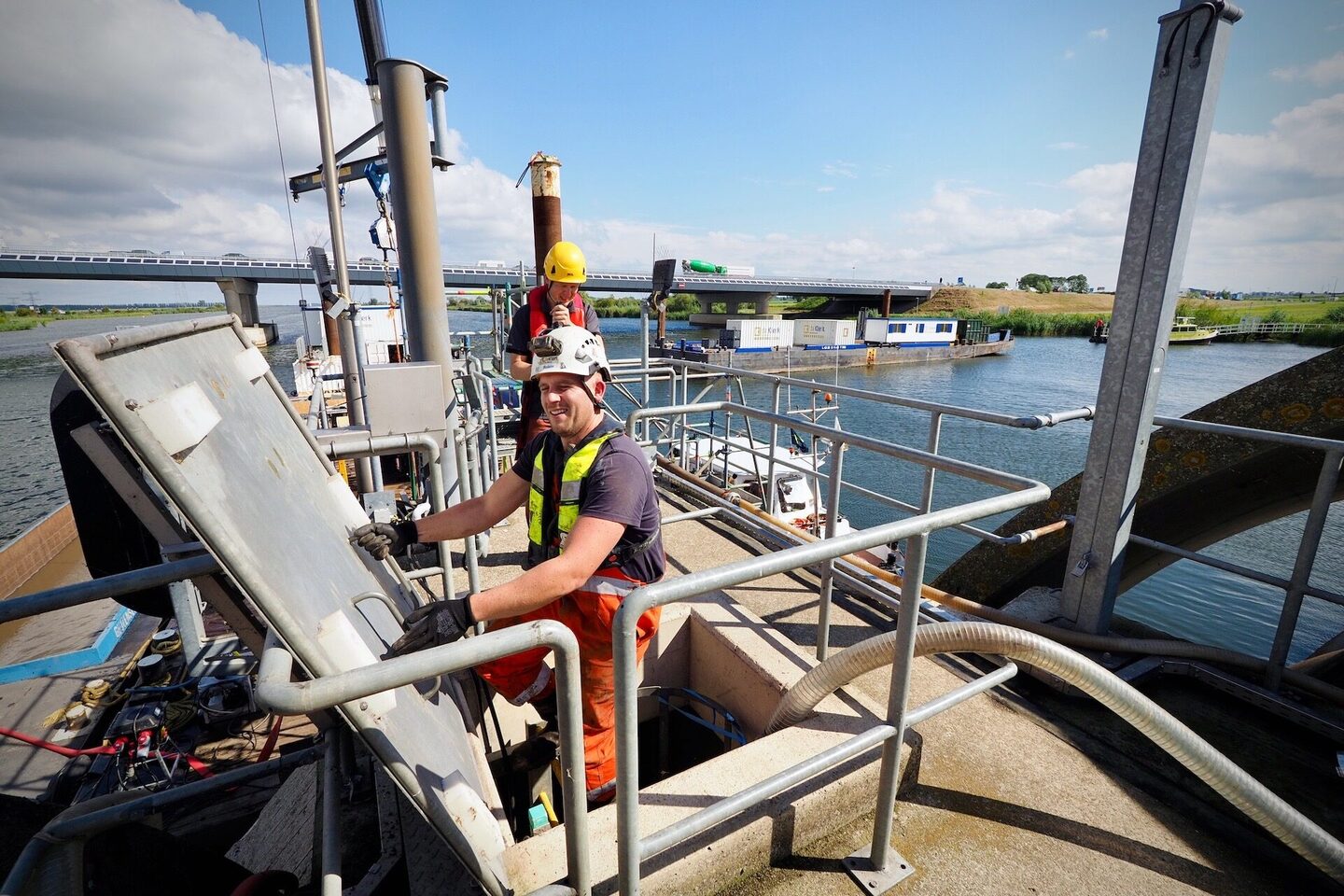 Het bijzondere van dit project is dat het onderhoud plaatsvindt in de balg, ca. zes meter onder waterniveau. Om in de balg te kunnen werken wordt deze opgeblazen, het water eruit gepompt en wordt in de ruimte een overdruk van 200 millibar opgezet, gelijk aan zo’n twee meter waterdiepte. De toegang tot de balg gaat via een luchtsluis van vier bij twee meter, met een deurbreedte van slechts één meter. Alle medewerkers, maar ook de materialen en gereedschap dienen via deze luchtsluis ingeschut te worden. Dit is bij elke schutting weer een logistieke uitdaging! De omstandigheden in de balg zijn intens. Naast de overdruk is het er donker en heerst er een hoge luchtvochtigheid. Onze medewerkers hebben daarom allen een duikmedische keuring ondergaan en de nodige veiligheidscursussen gevolgd.