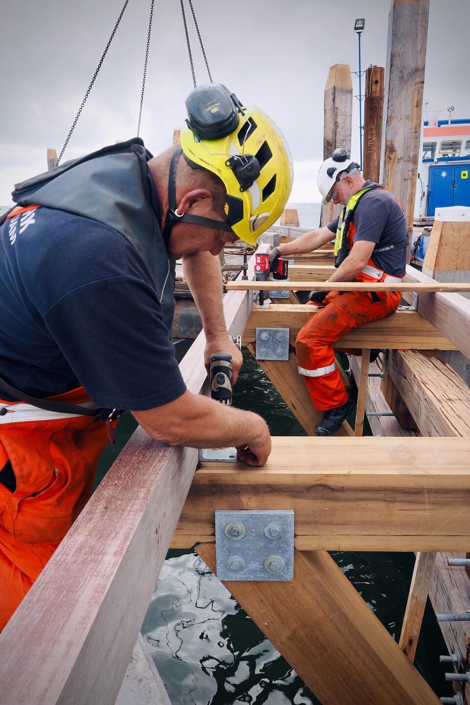 Tijdens het ontwerp- en uitvoeringsproces is bewust ingezet op duurzaam materiaalgebruik. Voorafgaand aan het verwijderen van de bestaande remming zijn de houten palen zorgvuldig geïnspecteerd op kwaliteit en herbruikbaarheid. Een aanzienlijk aantal palen voldeed nog ruimschoots aan de eisen en kon worden hergebruikt binnen het nieuwe ontwerp. Daarnaast is een groot deel van de houten onderdelen vervaardigd uit zorgvuldig geselecteerd hergebruikt hout. Deze aanpak sluit aan bij de duurzame werkwijze die De Klerk in al haar projecten nastreeft: verantwoord omgaan met grondstoffen en waar mogelijk circulaire oplossingen toepassen.